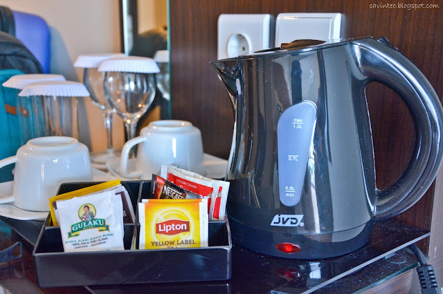 Complimentary two bottles of mineral water (already taken by my sister who is an amazing water guzzler), sachets of coffee and tea, an electric kettle and a mini fridge right underneath.