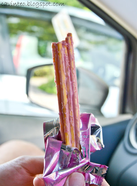 Melted strawberry pocky sticks due to the hot sun shining into the car; Alex didn't give a damn and proceeded to finish them in a mere seconds.