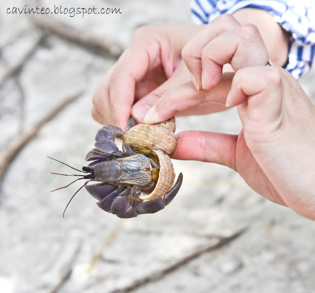 A crowd had gathered near one of the trees near the beach and being my usual nosy self; i stepped ahead to check it out. There's this tourist (not going to mention nationality) who was trying to coerce this hermit crab (the coenobita cavipes species) out of its shell!