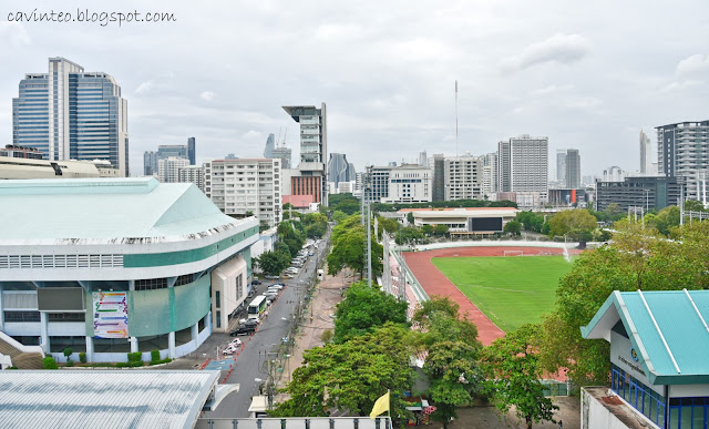 There are actually two stadiums but you can't really see the one on the left. Right behind is the prestigious chulalongkorn university and further away, you would catch sight of the pixelated building called MahaNakhon Tower.