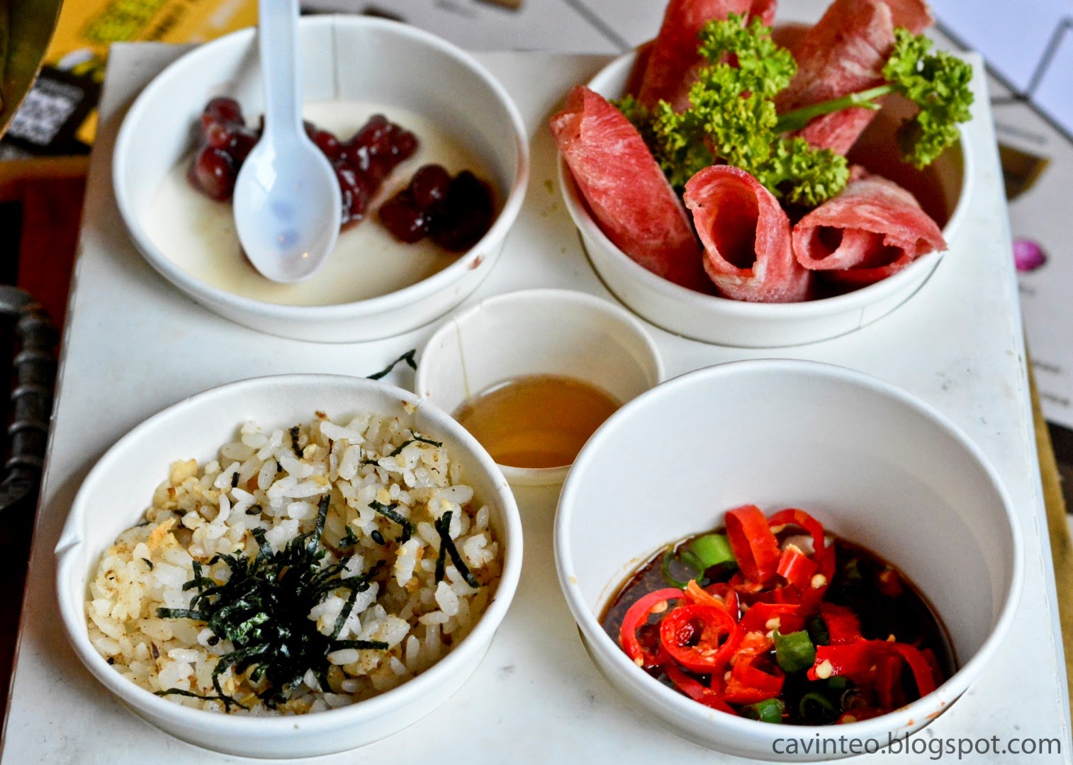 Wait, there's more! A bowl rice mixed with sesame seeds, seaweed and Katsuobushi shavings, a small cup of vinegar honey and a serving of milk pudding!