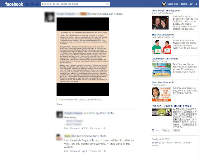 I am a middle child and despite hearing so much of the middle child syndrome, my situation is slightly more unique as i also happen to be the only son in a Chinese family. Nevertheless, just a few paragraphs for your reading pleasure.