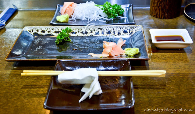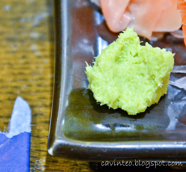Freshly grated wasabi again! Honestly, the real thing was so much better; spicier definitely. I put just a bit on the first piece of sashimi before rolling it up and using my deft chopstick skill, dabbed it in the soy sauce before placing the entire content into my mouth. Almost choked my guts out!